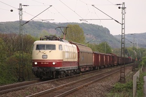 13. April 2011 - DB 103 235-8 mit einem Güterzug unterwegs kurz vorm Bf Bonn-Beuel Ri. Köln.